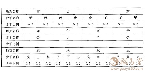 根据以上“中和”的三个原则,当然首先要判断日干的强弱。要求得日干的强弱,第一步,要弄清天干和地支的关系。何建忠认为:“地支中藏有天干的‘物质,,而这些.‘物质’会影响天干各五行的强旺。在八字的四个地支中,‘月支’是最具有影响力的;也因此如果月令中的藏f能全部助长某天干、五行,则我们称此天干、五行‘当令’;若完全不助长某天干、五行,则此天干五行“不当令’;而若有0. 3成分能助长某天干、五行,则此天干、五行有0.3‘当令’,其他以此类推。"?而确定“当令”程度,则是依据以下表格: